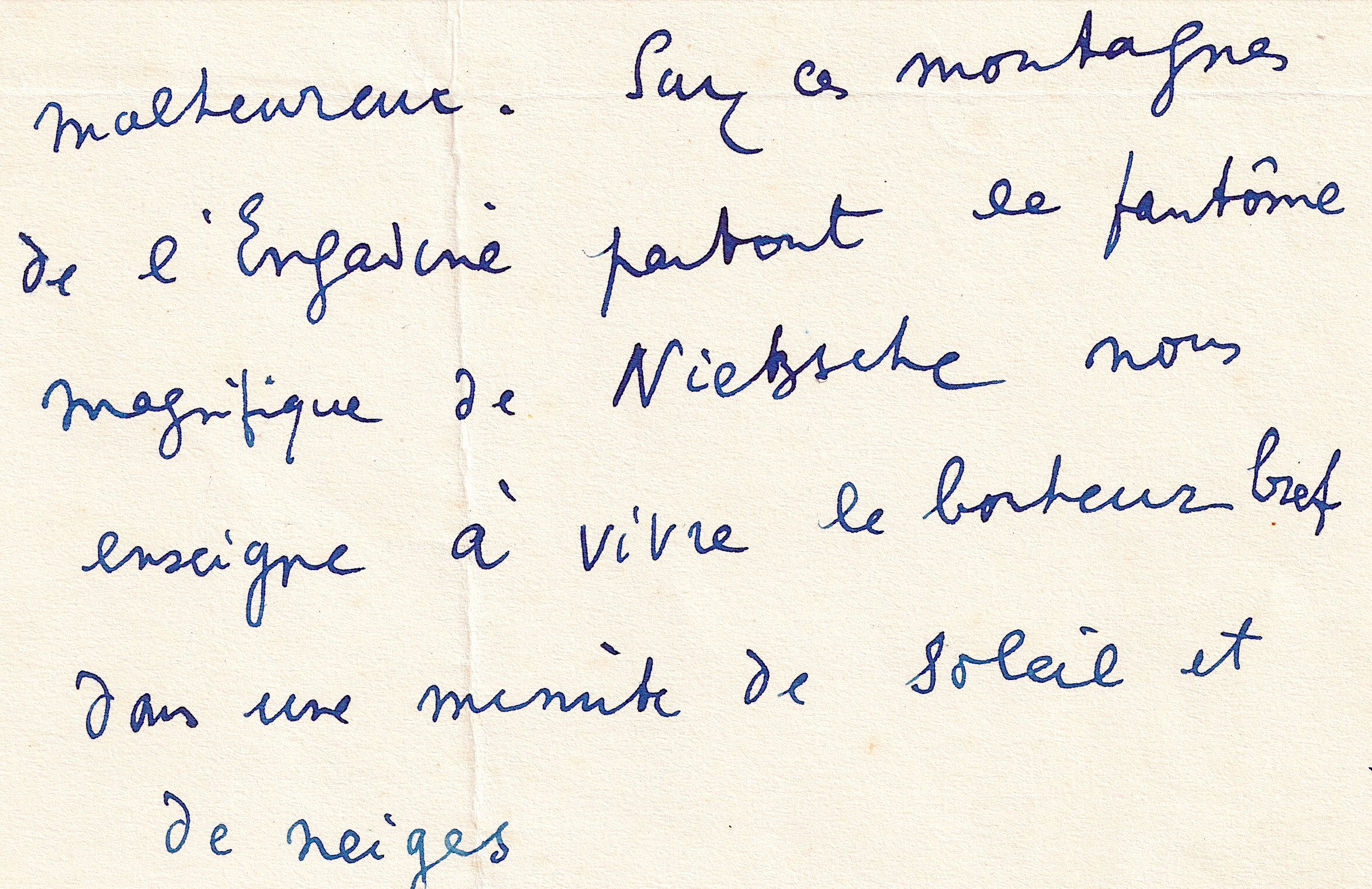 Belle et spirituelle lettre évoquant Nietzsche depuis Sils-Maria dans la haute Engadine où Nietzsche eut sa révelation de l’éternel retour.