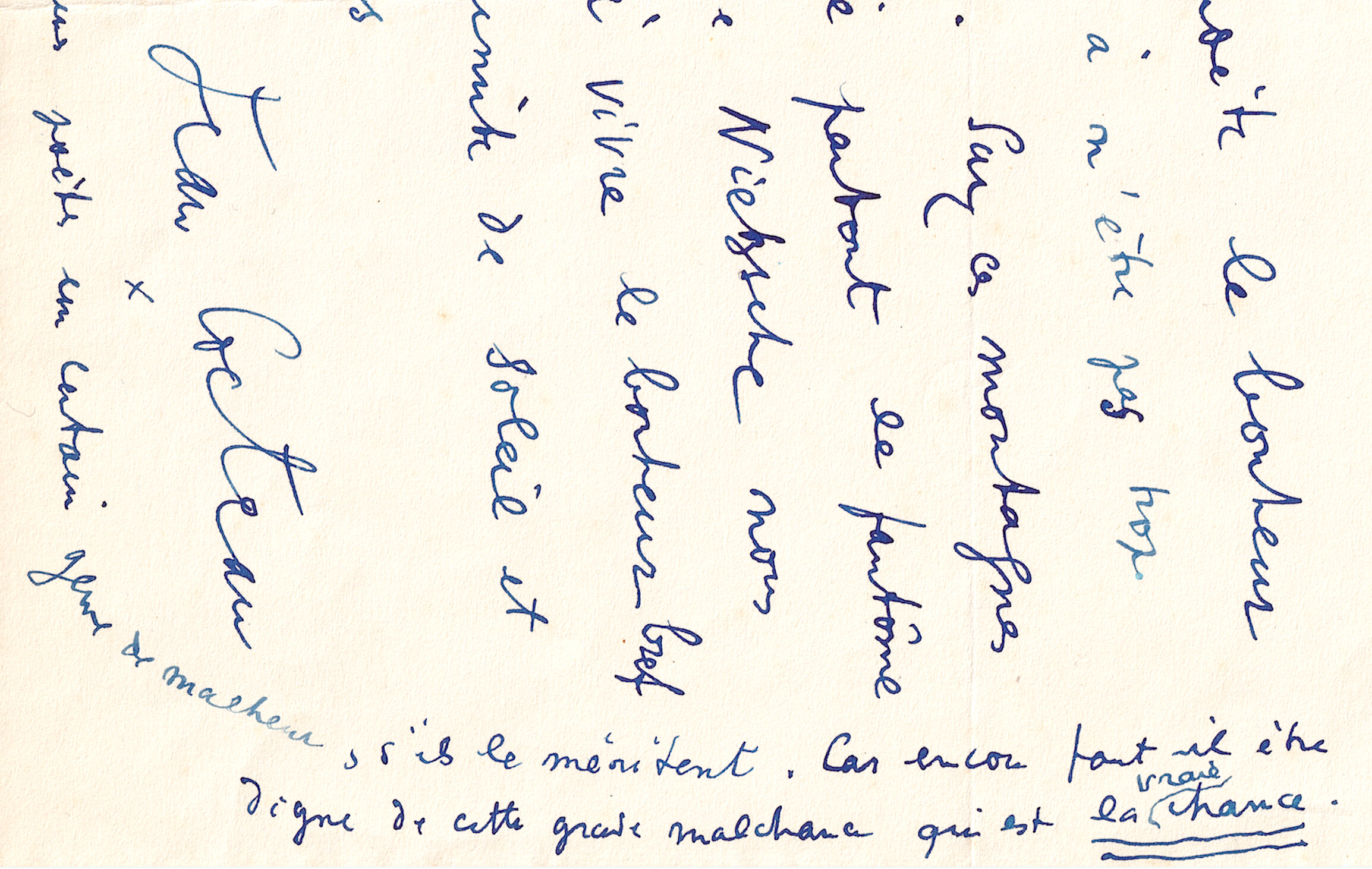 Lettre autographe signée de Jean Cocteau (1889-1963), peut être au critique d’art Henri Corbière (1888-1980).