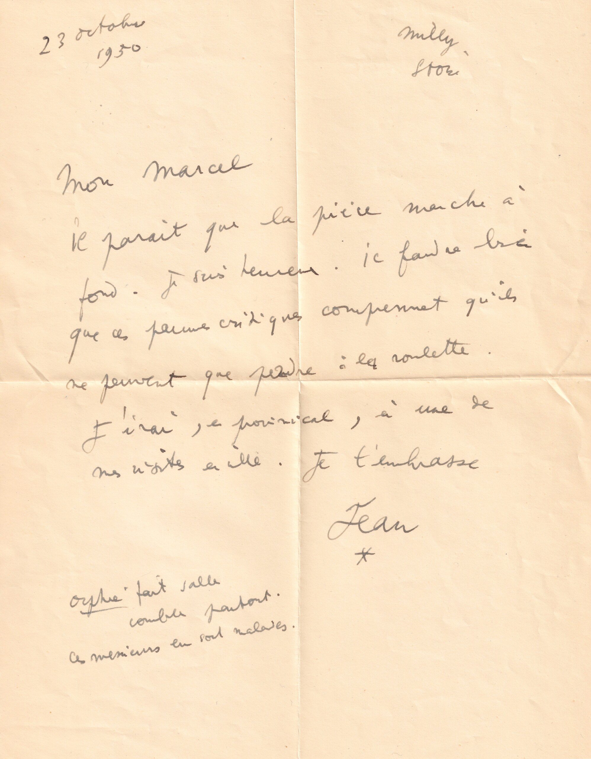Lettre autographe signée de Jean Cocteau (1889-1963) à l’écrivain, dramaturge et réalisateur Marcel Achard (1899-1974).