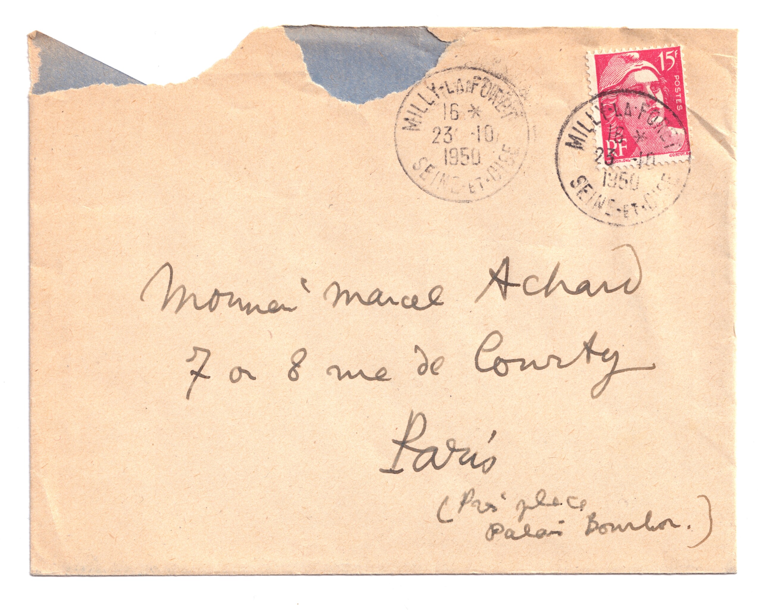 Milly-La-Forêt, 23 octobre 1950. Une page in-4. Taille : 27 x 21 cm. Enveloppe autographe et timbre conservés.