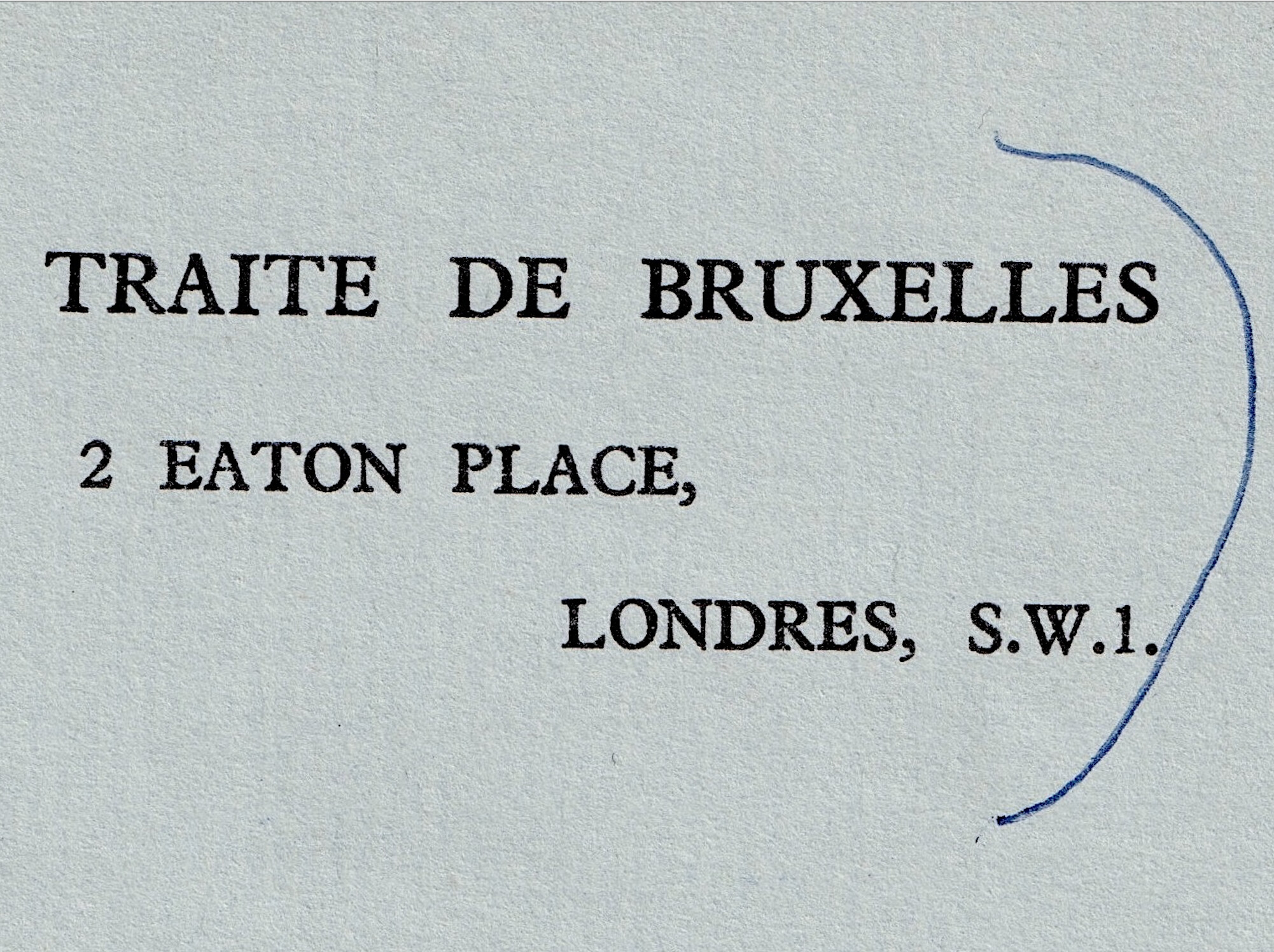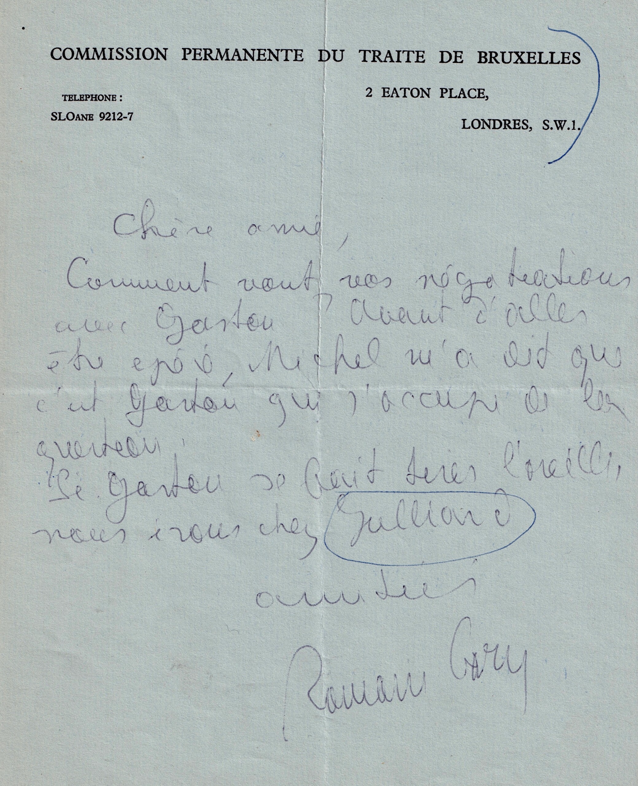 * En 1954, Gary n’est pas promu conseiller de première classe avant la fin de sa mission à New York. À son retour, il est nommé secrétaire d’ambassade à Londres. Sur l’en-tête : Le traité de Bruxelles prévoyait l’organisation d’une coopération militaire, économique, sociale et culturelle entre ses États membres, ainsi qu’une clause de défense mutuelle. Il fut signé pour 50 ans entre la France, le Royaume-Uni, la Belgique, les Pays-Bas et le Luxembourg. Il donne naissance à une Union occidentale qui préfigure l’Union de l’Europe occidentale, une alliance uniquement défensive.