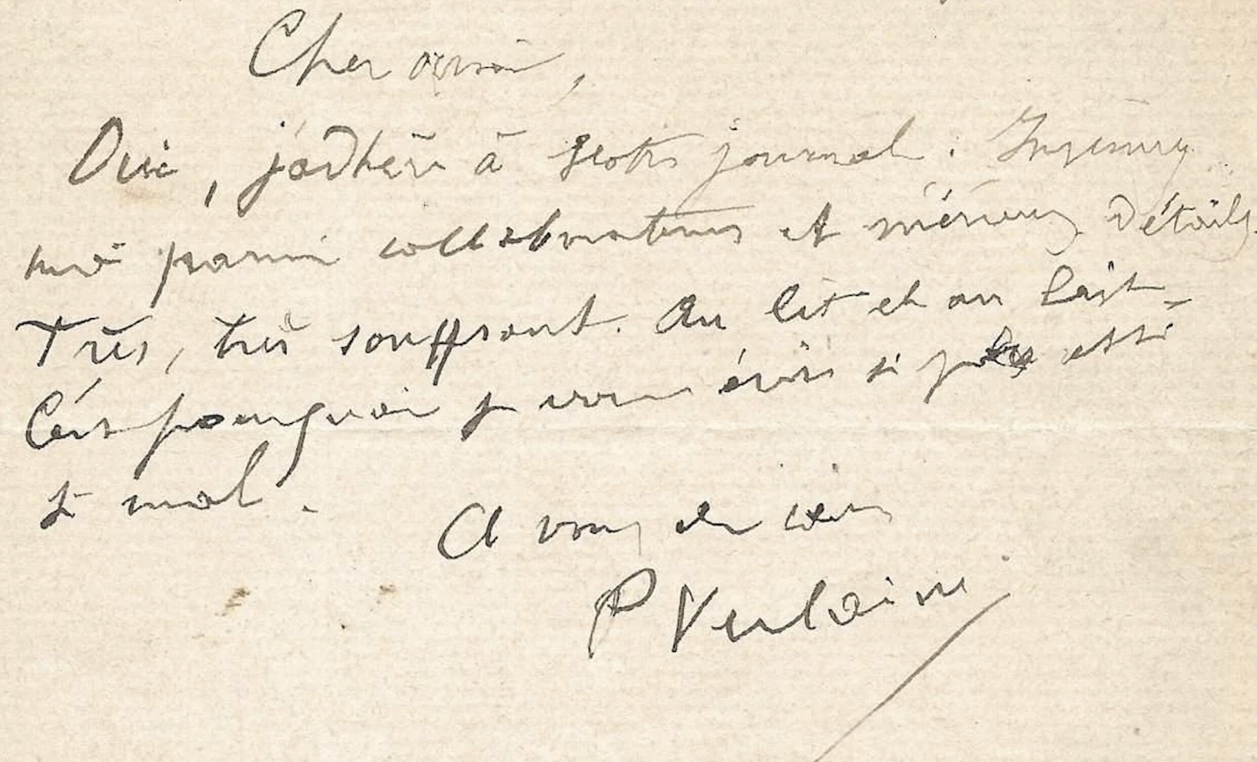 Dernière lettre manuscrite connue de la main du poète avant sa mort le 8 janvier 1896. Les manuscrits ultérieurs seront de la main de sa maîtresse, Eugénie Krantz.