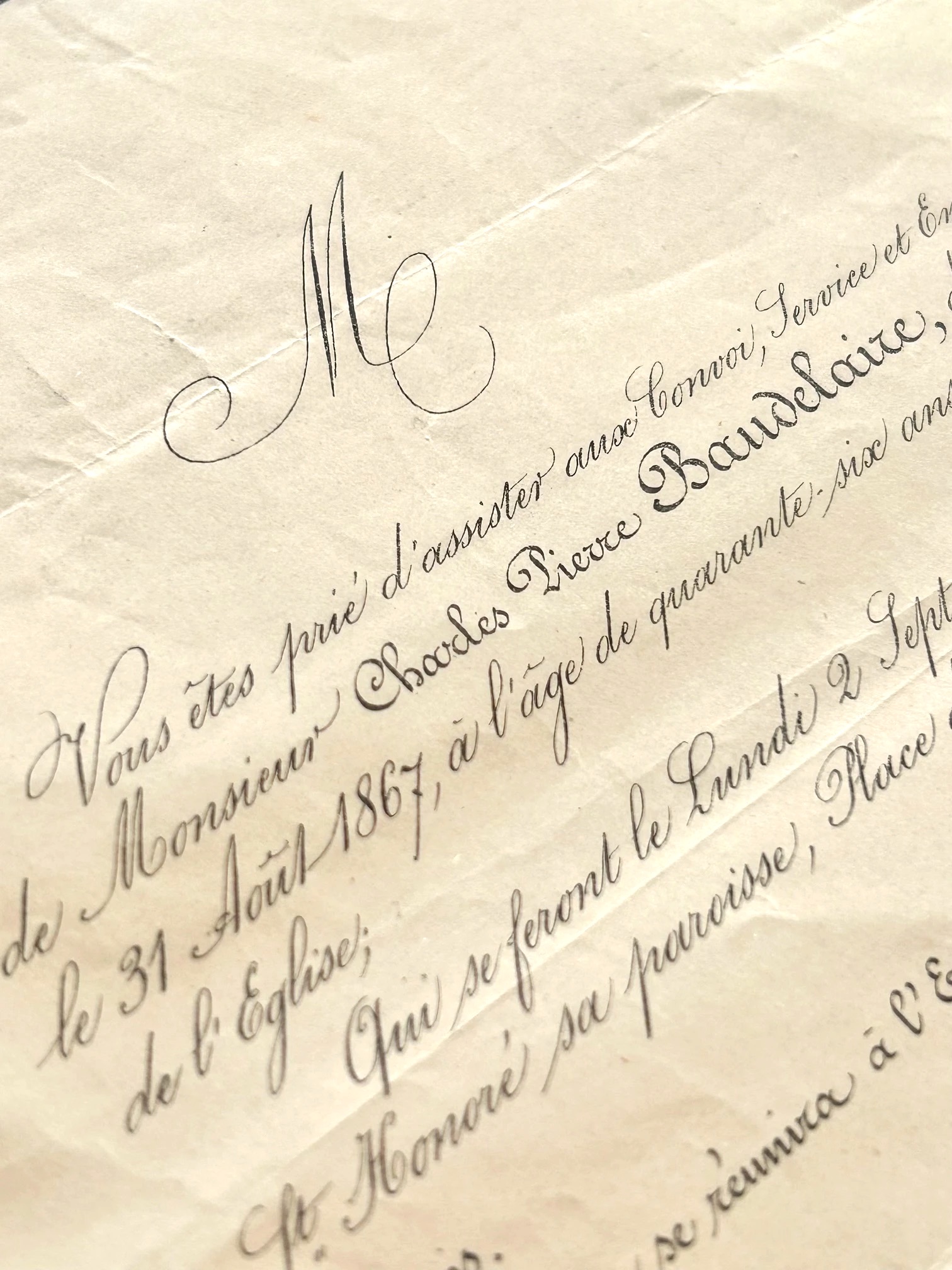 Vous êtes prié d’assister au convoi, service et enterrement de Monsieur Charles Pierre Baudelaire, décédé à Paris le 31 août 1867, à l’âge de quarante-six ans, muni des sacrements de l’Église ; Qui se feront le lundi 2 septembre prochain, à l’église Saint-Honoré, sa paroisse, place de l’Hippodrome, à 11 heures précises.