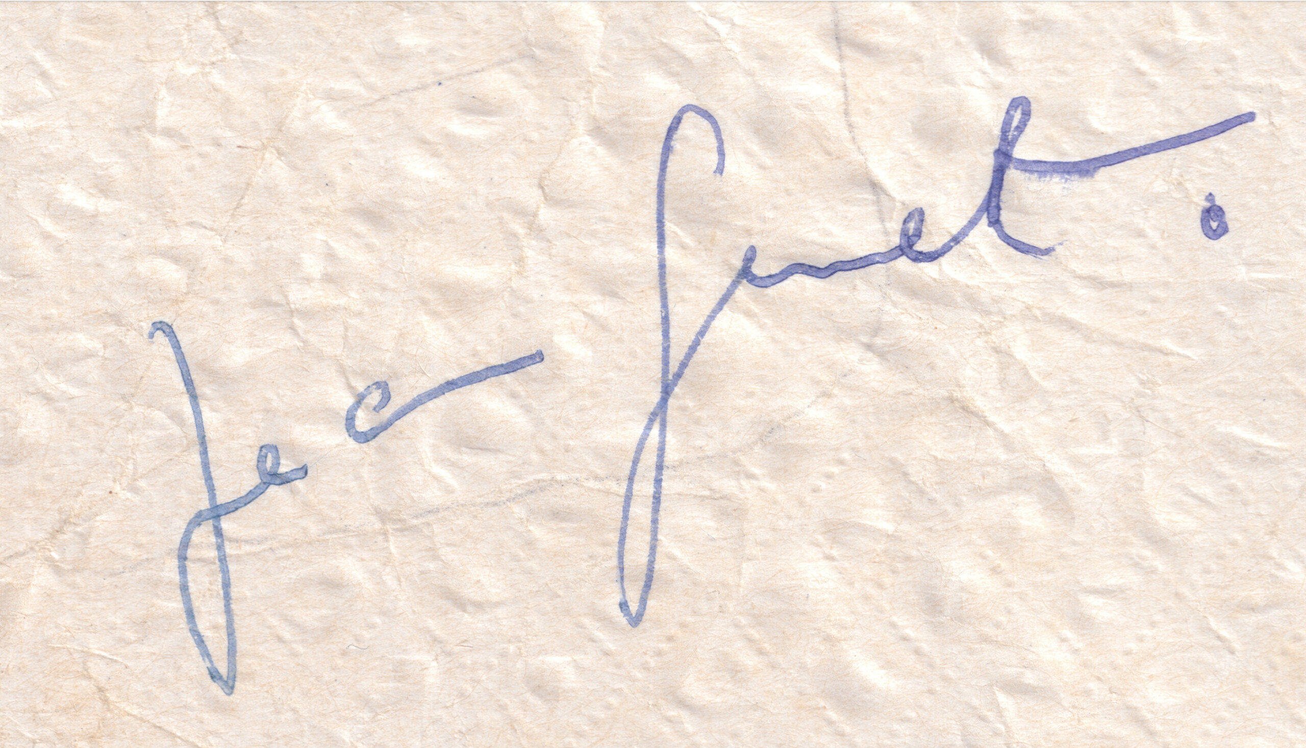 [Paris], s.d. [C. 1947], 1 p. in-4° – 23 x 20 cm. Sur un papier de nappe de bistrot blanc typique (perlé de ses micro-bulles habituelles), contrecollé sur un fin carton fort. Certificat d’authenticité.