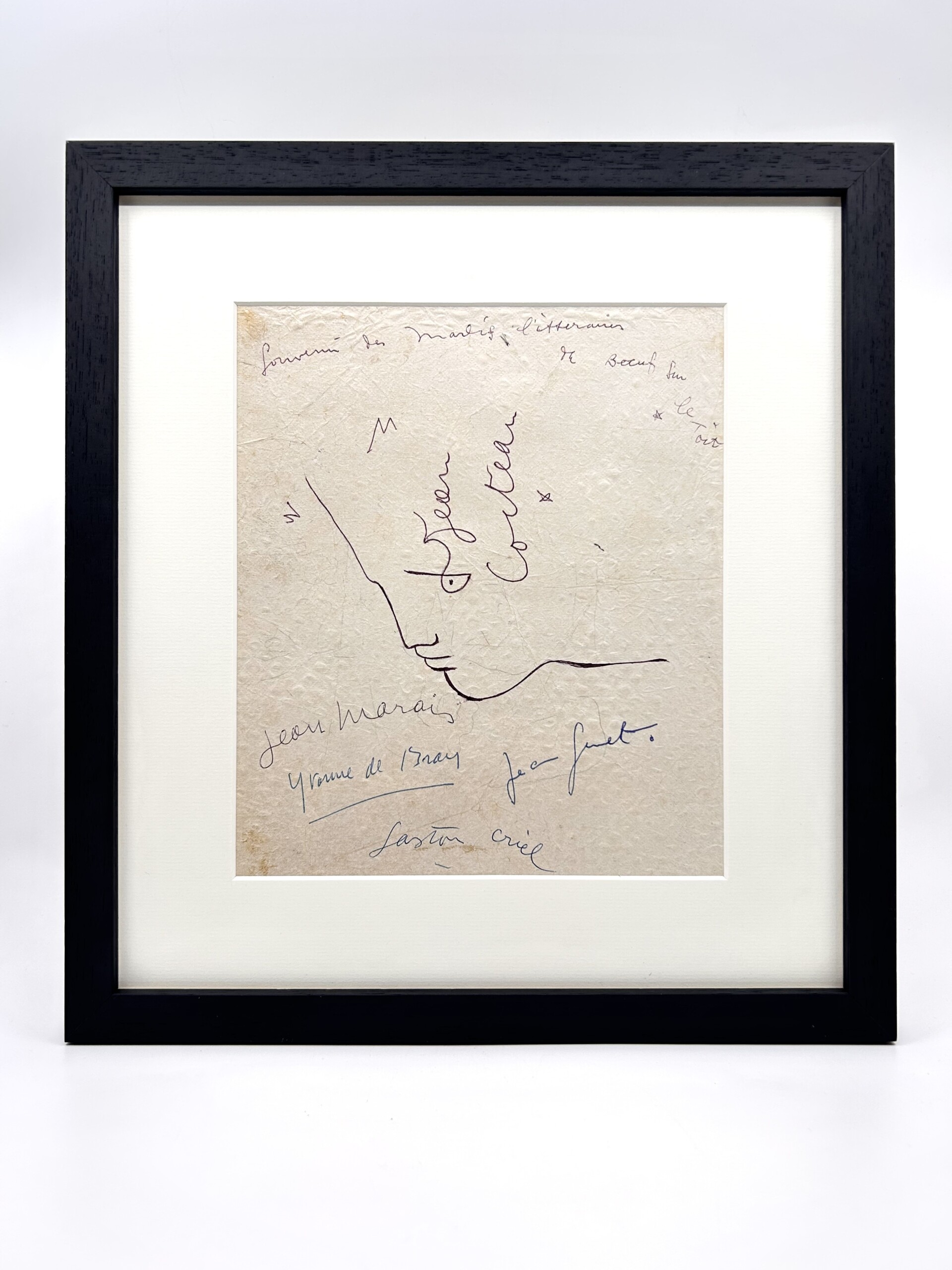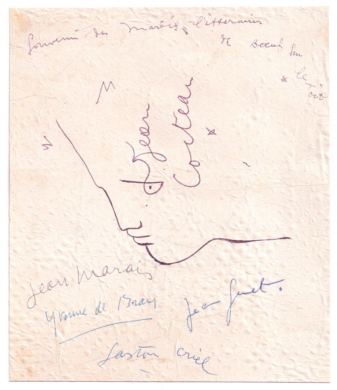 Jean Cocteau – Dessin original signé à l’encre violette enrichi des signatures autographes de Jean Genet, Jean Marais, Yvonne de Bray et Gaston Criel.