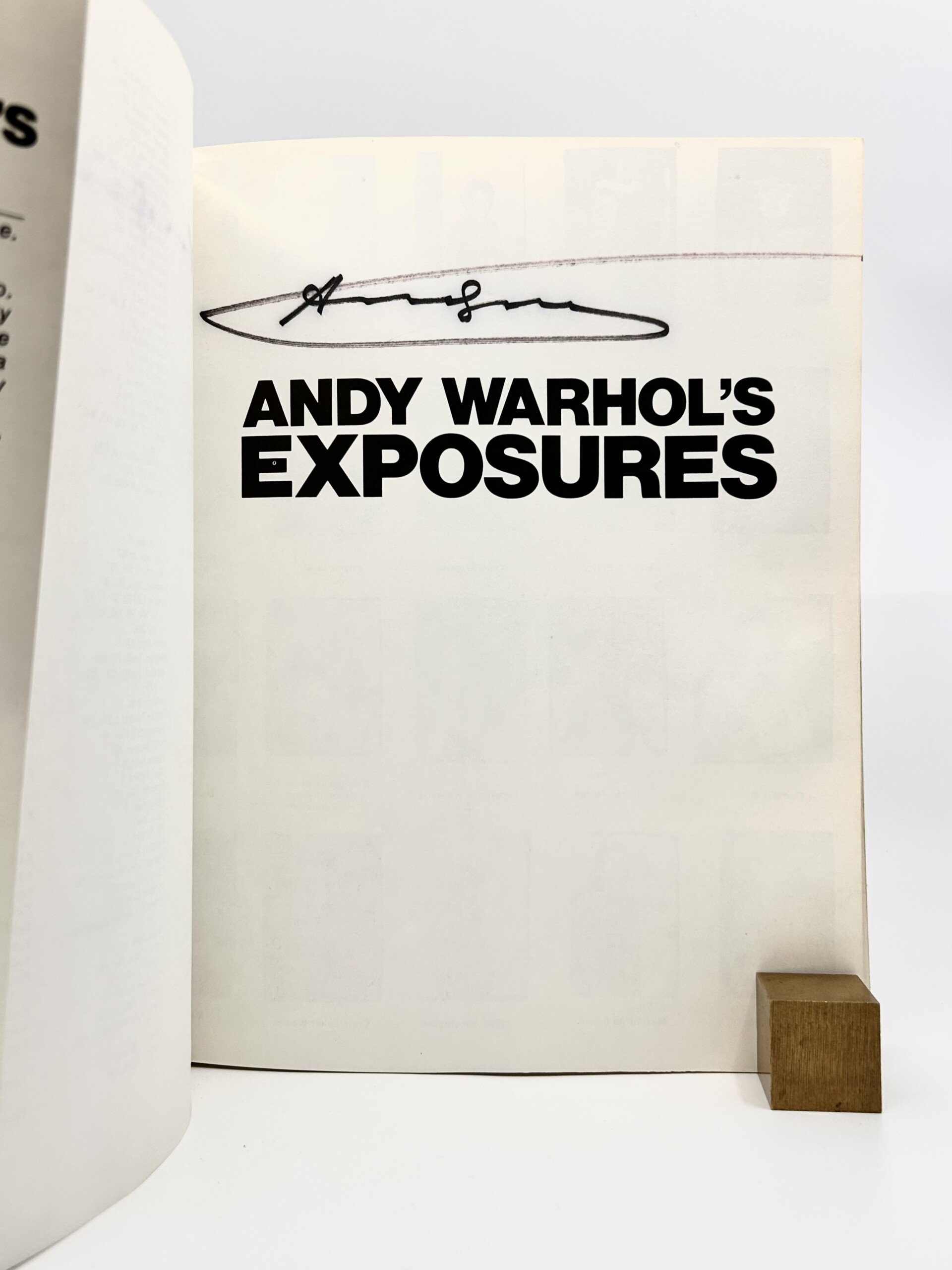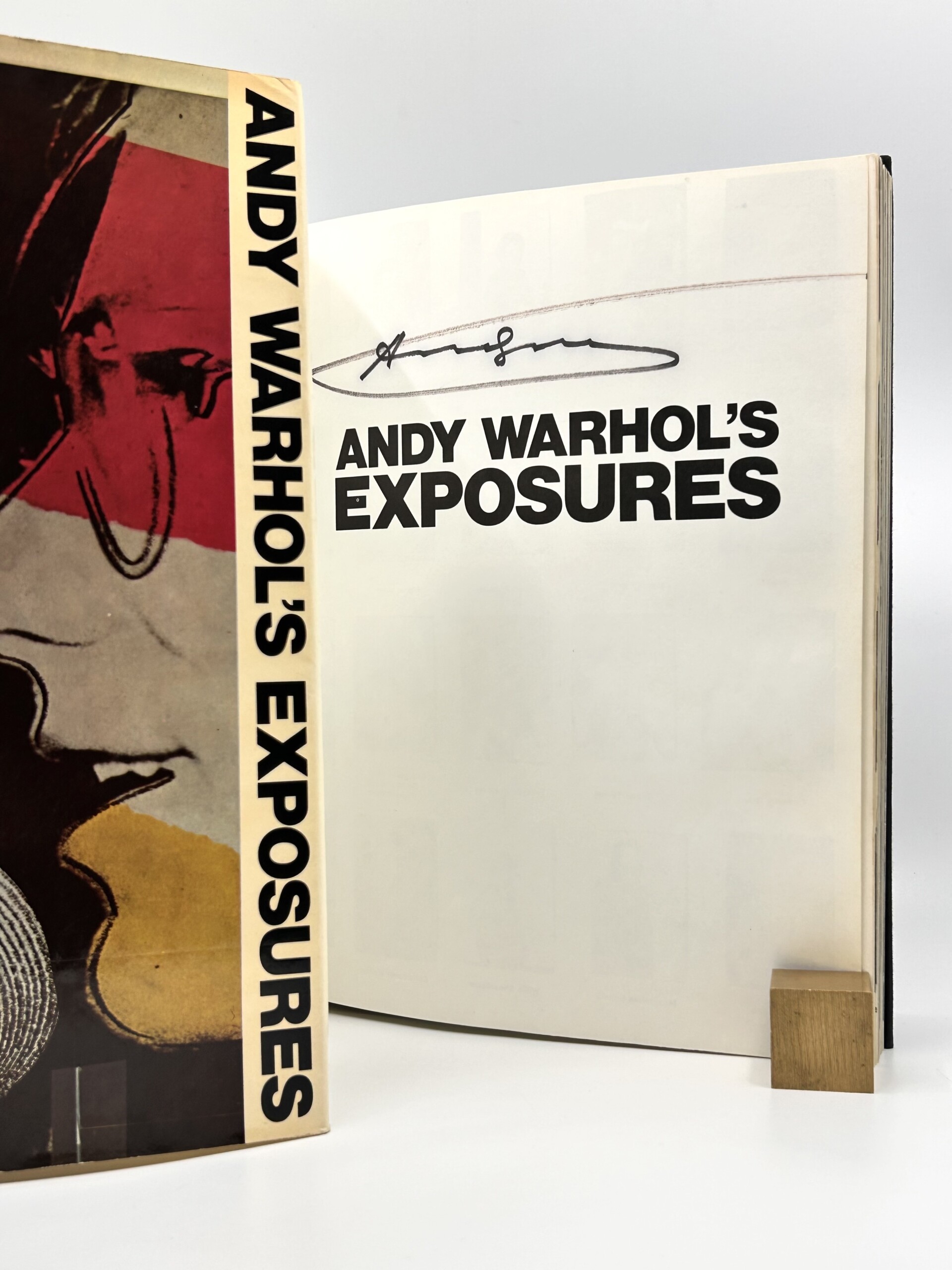 Magnifique signature autographe de grande taille (15- 20 cm) d’Andy Warhol (1928-1987) au feutre noir sur l’édition originale anglaise d’ ANDY WARHOL’S EXPOSURES, son premier recueil de photographies.