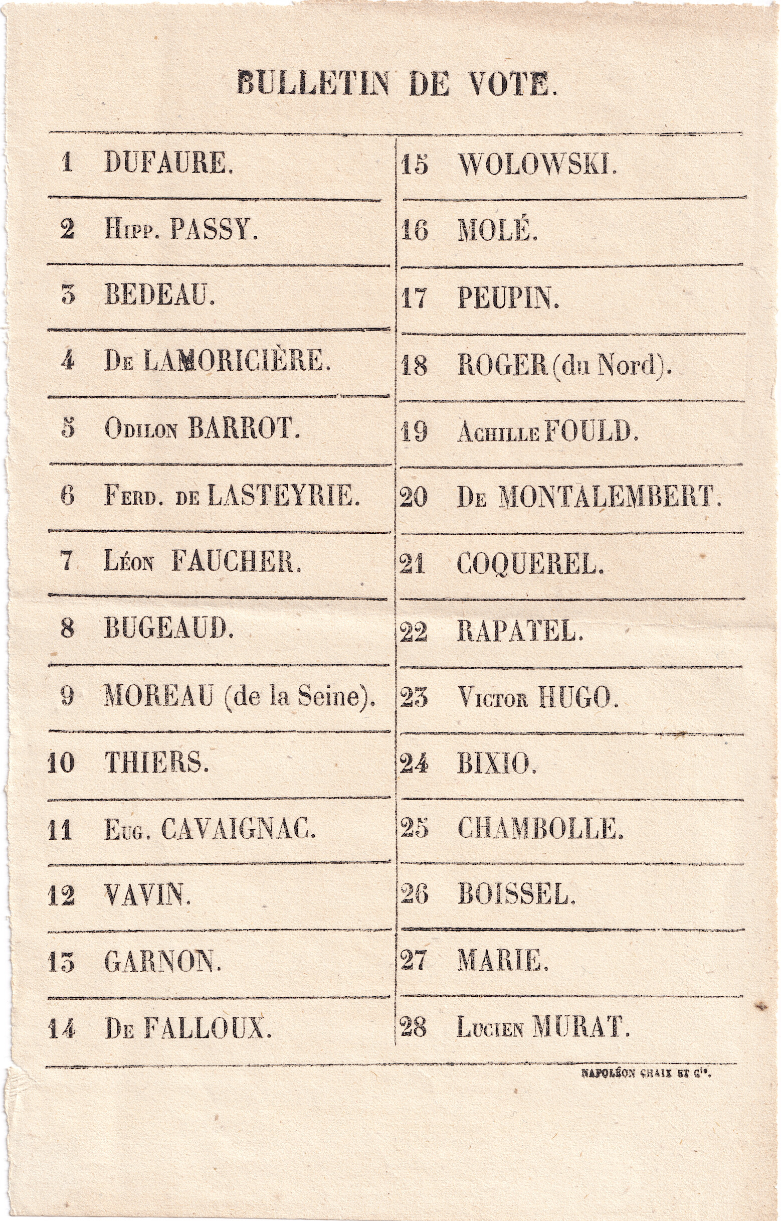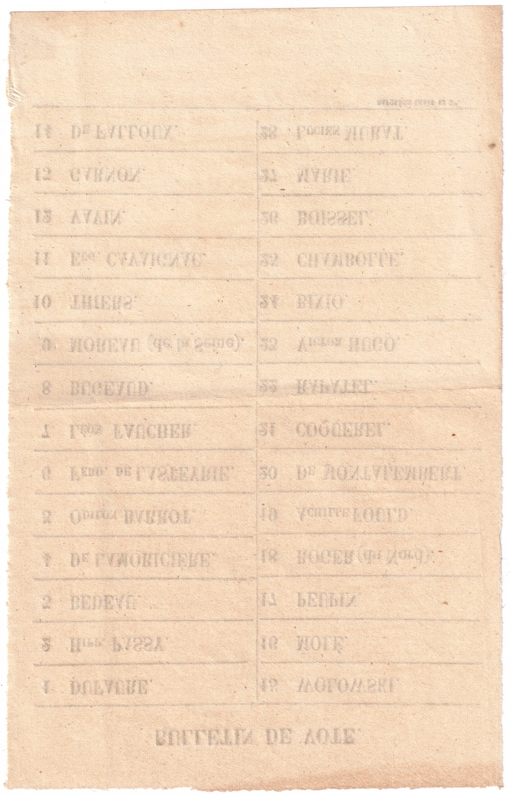 Bulletin de vote original des élections législatives de mai 1849, portant la candidature de Victor Hugo et à l’issue desquelles Hugo est élu député pour la seconde fois, représentant de la Seine.
